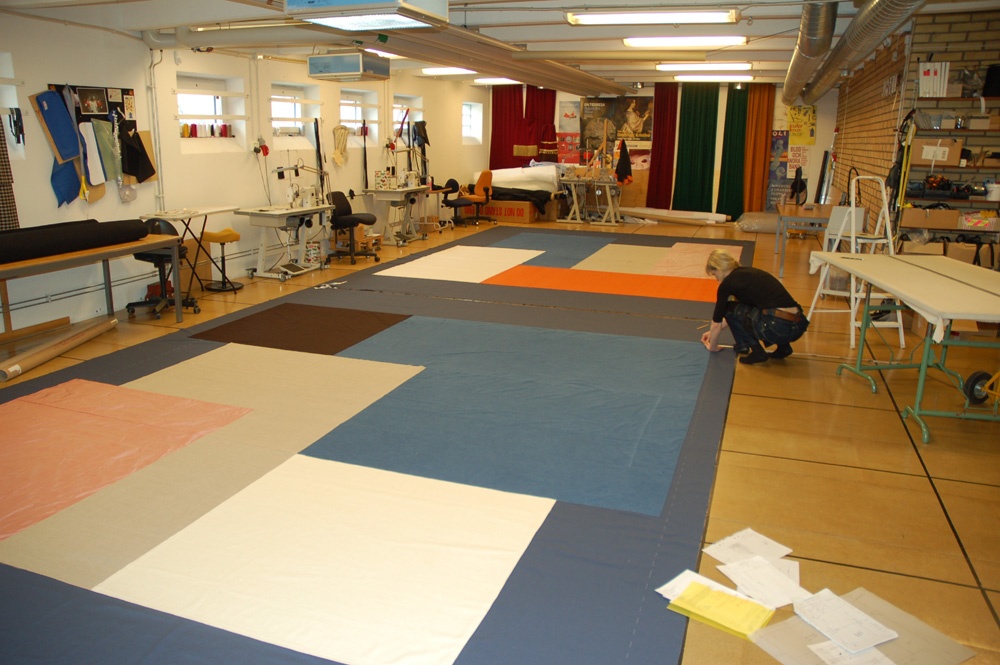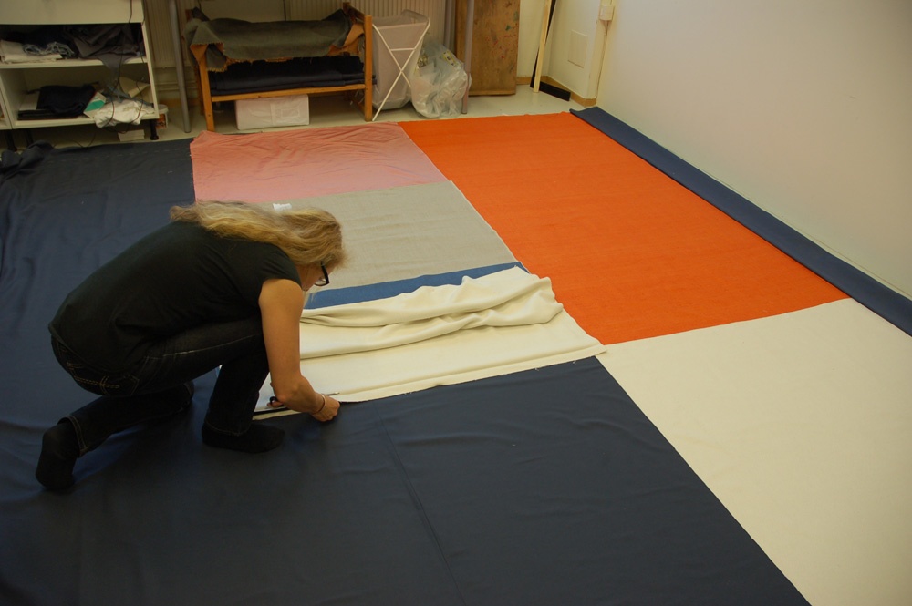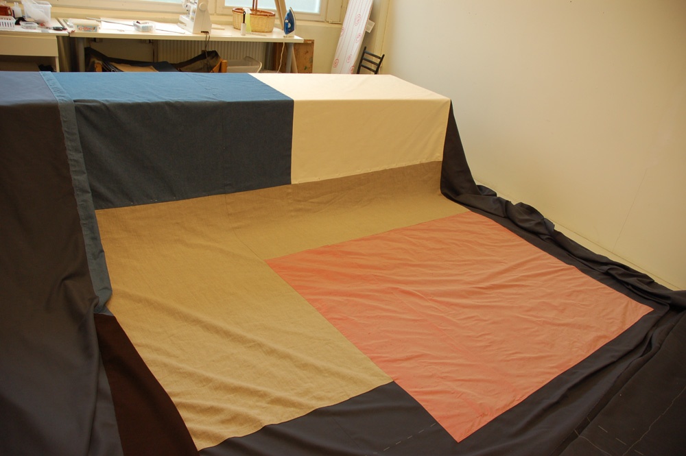 Ridån är en komposition av färger och olika textila material. Jag jobbar med komplementfärgerna blått (denim) - orange, med beige (oblekt lin), rosa, brunsvart och benvitt. Ljuset absorberas eller reflekteras olika mot ull eller siden, detta kan utnyttjas vid ljussättning och veckbildning för att skapa större variation i bilden.