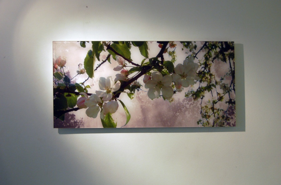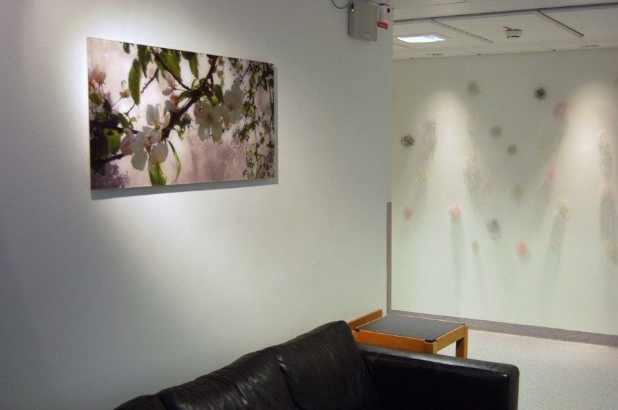 En plats för drömmar En fondvägg i anslutning till entrén med ljusa, lätta bollar i ett par olika färgnyanser. Knutna i tagel och lätta som moln. Längre in på avdelningen finns fyra ljuslådor med svartvita naturbilder tagna med en enkel plastkamera. I anslutning till fondväggen i entrén hänger ett digitalfoto, äppelblommor, tryckt på plexiglas.