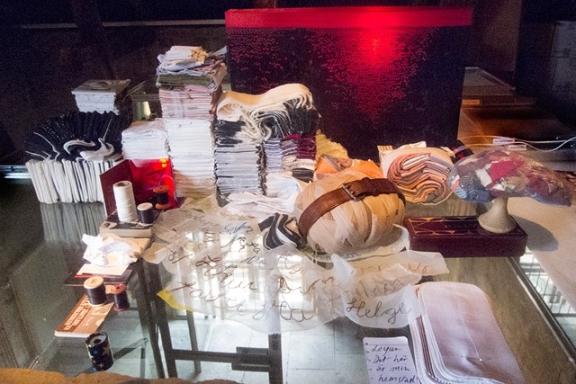 Vi pratar om våra mödrar som vävde och broderade. Min hög med ihopsydda skjortmanchetter påminner Lele om formen på de kinesiska skosulor som hennes mamma lagade genom att göra små broderier på det slitna.