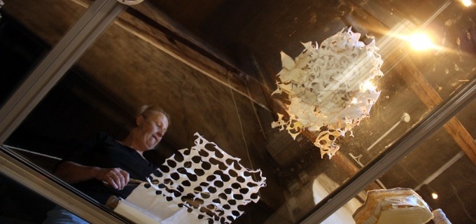 Vi skrattar åt fenomenet med linneskåp som vi båda verkar ha lite skräckblandad förtjusning inför. Detta med vikningar har vi gemensamt och jag får en förklaring på varför det så ofta förekommer i östasiatisk konst. Som barn leker man ofta med papper i brist på andra leksaker. Tekniker som origami faller sej naturligt ur den synvinkeln. Hos Lele ser jag det i form av fjäderlätta konstruktioner som med enkla handgrepp går att förändra, fälla upp och ihop, till synes bräckliga men med förvånansvärd hållbarhet.